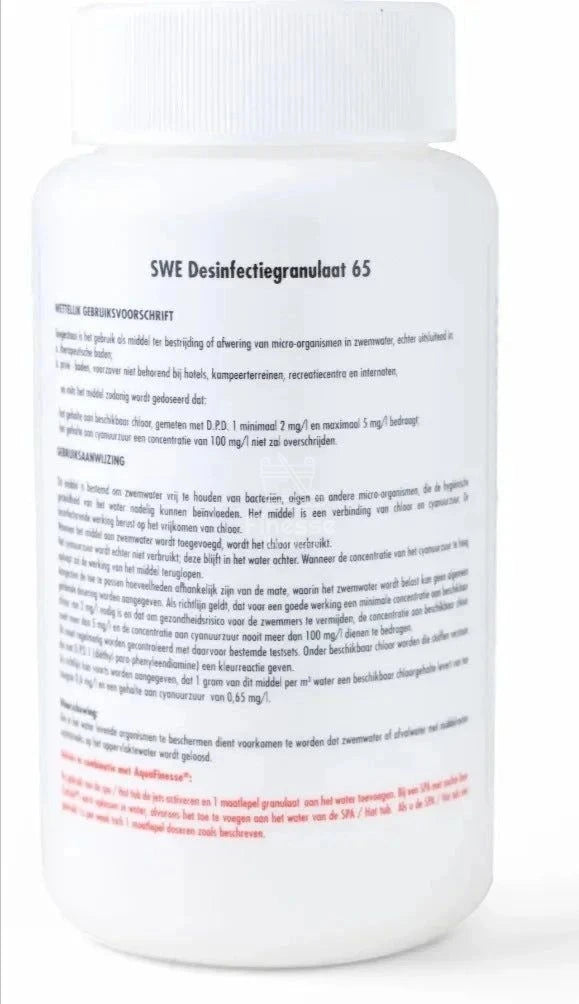 AquaFinesse chloor granulaat is een krachtige chloorverbinding in poedervorm die speciaal is ontwikkeld voor spa's. Het zorgt voor een snelle en effectieve desinfectie van het water, waardoor u optimaal kunt genieten van uw spa zonder zorgen over bacteriën en algen.